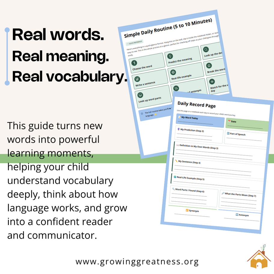 Children learn to notice unfamiliar words while reading, predict meaning using context clues, break words into prefixes and roots, connect words to real experiences, and confidently use new vocabulary in conversation and writing.